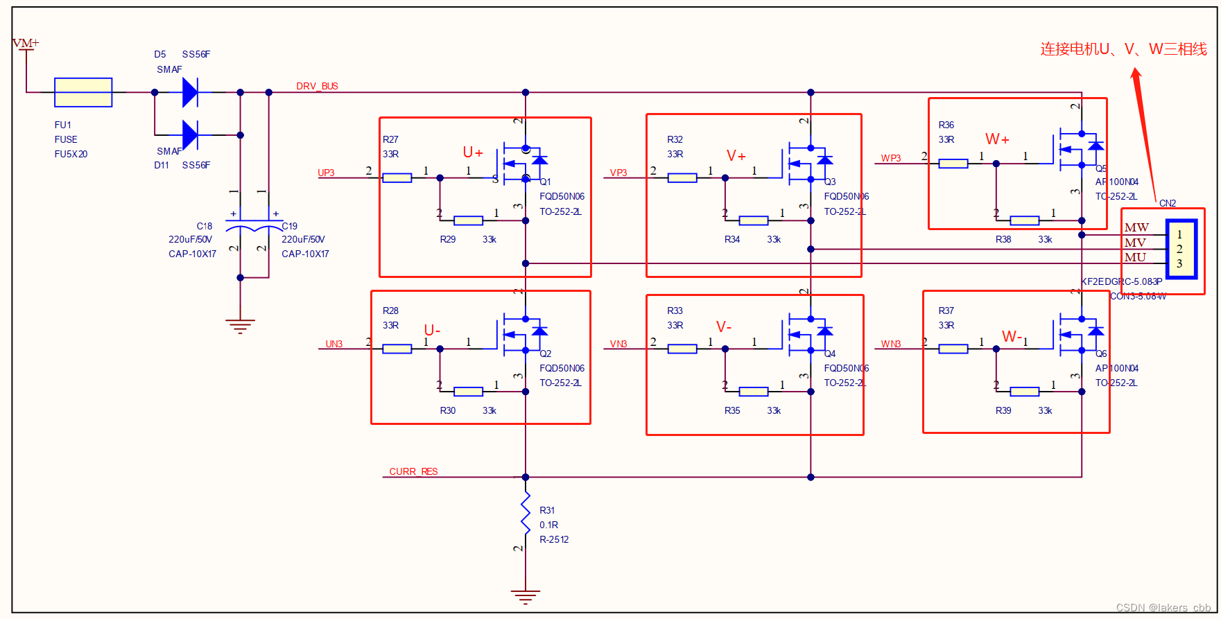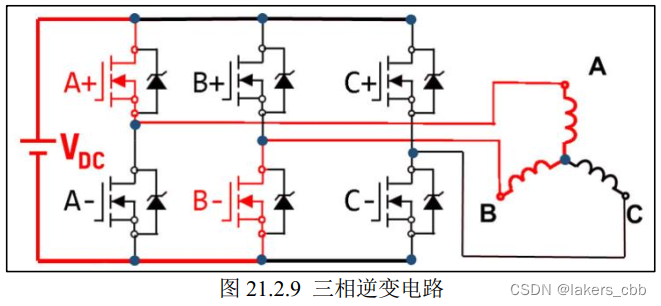 所谓的三相逆变电路就是由三个半桥构成的电路,A+A-(U+U-)为一个半桥,B+B-(V+V-)为一个半桥,C+C-(W+W-)为一个半桥,共三个半桥,这三个半桥分别对应A(U)、B(V)、C(W)三相绕组。