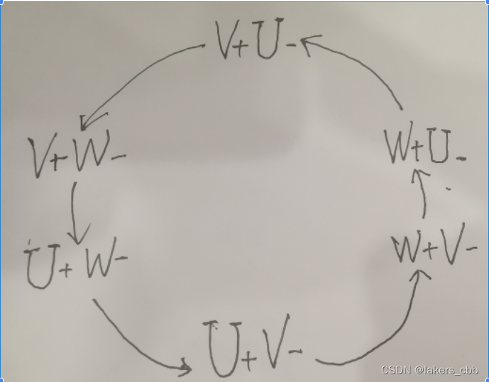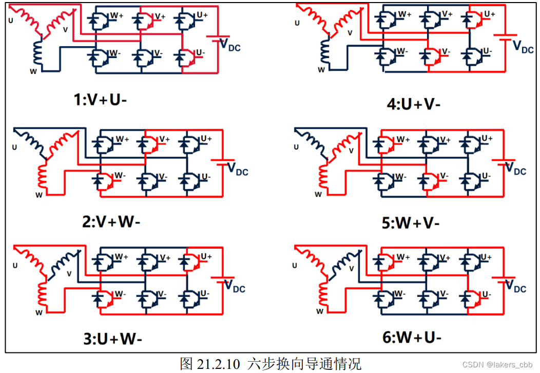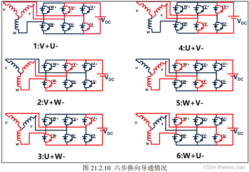 V+U- W+U- W+V- U+V- U+W- V+W- 按照这个顺序换向是电机正转(CW、顺时针),如下图所示