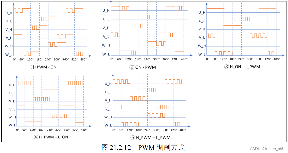 H_PWM – L_ON: 某一相上半桥始终以PWM方式控制,另一相下半桥始终保持高电平(也就是下半桥常开导通),