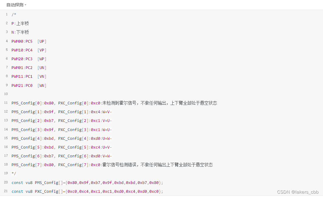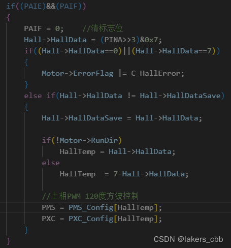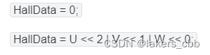 上述摘抄出来的2行代码是核心的换向算法,是将霍尔值和换向表和上下桥臂的导通关系映射在一起了。