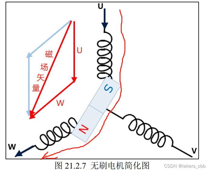 如上图所示,电流由U留到W。U相接正极,W相接负极,V相开路,那么此时电流由U相流到W相,同时U相和W相产生的磁场合成的磁场矢量方向即为转子磁场方向。