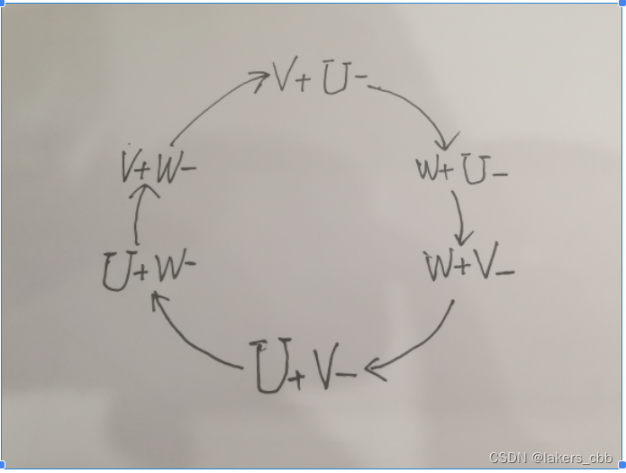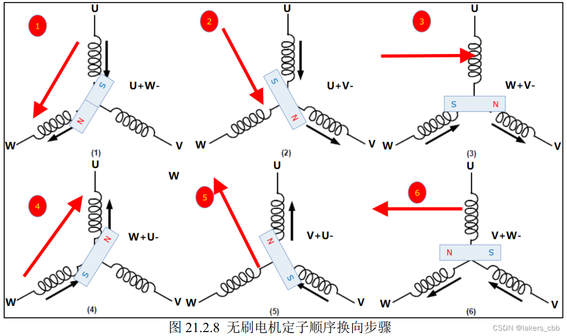 V+U- V+W- U+W- U+V- W+V- W+U- 按照这个顺序换向是电机反转(CCW、逆时针),如下图所示