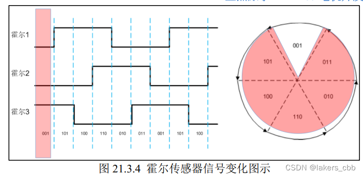 同无刷电机均匀分布的定子一样,用于输出3路磁场信号的3个霍尔传感器也是均匀分布在无刷电机的一周的,每相相邻两个传感器电角度相差120°,电机按照一定方向转动时,3个霍尔的输出会按照6步的规律变化。
