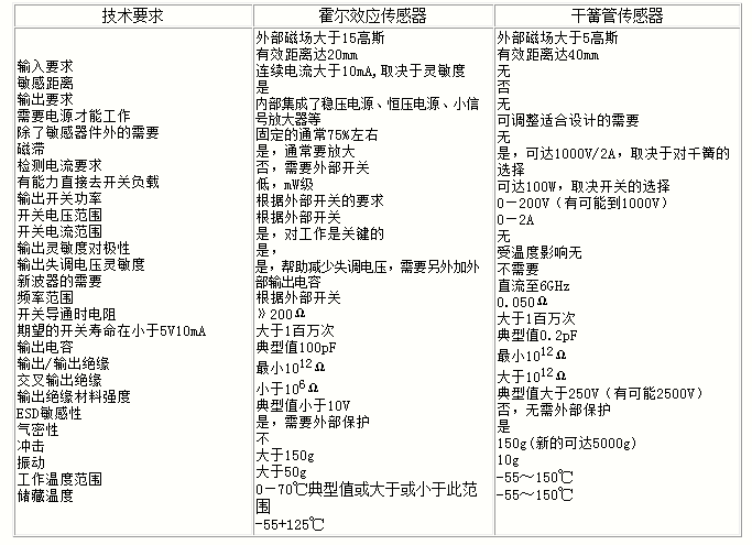 在干簧管和霍尔效应两种传感器的技术上,其尺寸都在缩小。然而,当干簧管传感器与霍尔效应传感器相比较时(见附表),可以看到干簧管的一些优点: